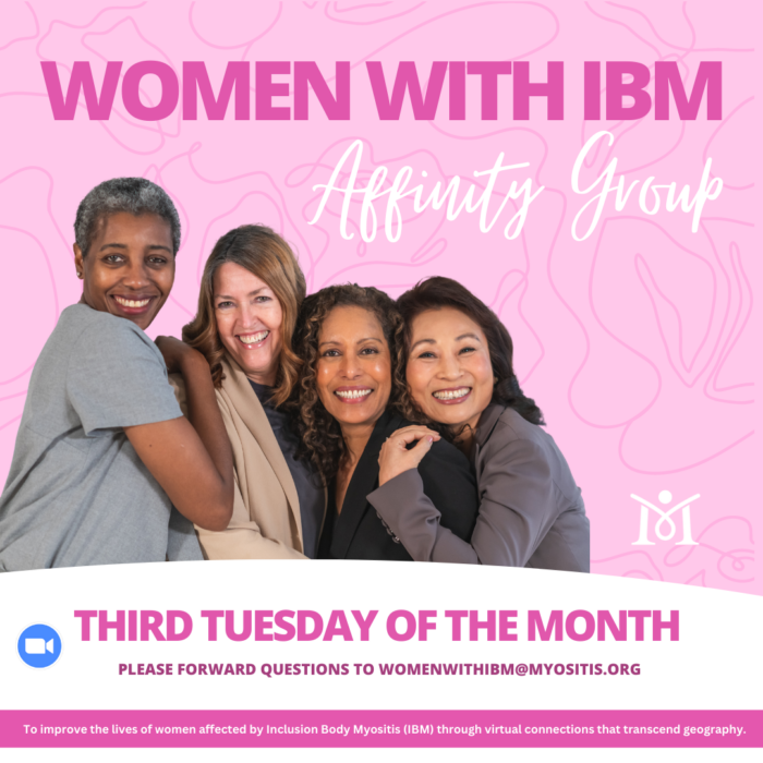 The mission of TMA Women with IBM Affinity Group is to improve the lives of women with inclusion body myositis through virtual connections and support that transcends geography. Meets on the third Tuesday of most months at 12 PM ET | 11 AM CT | 10 AM MT | 9 AM PT. Register here.